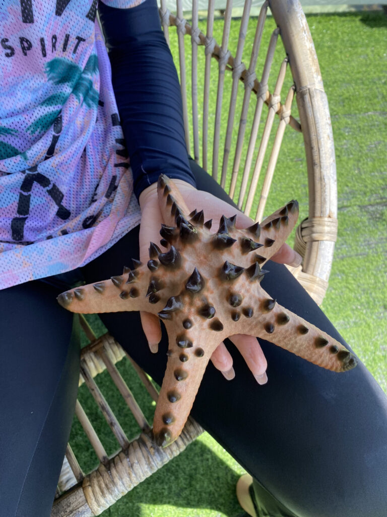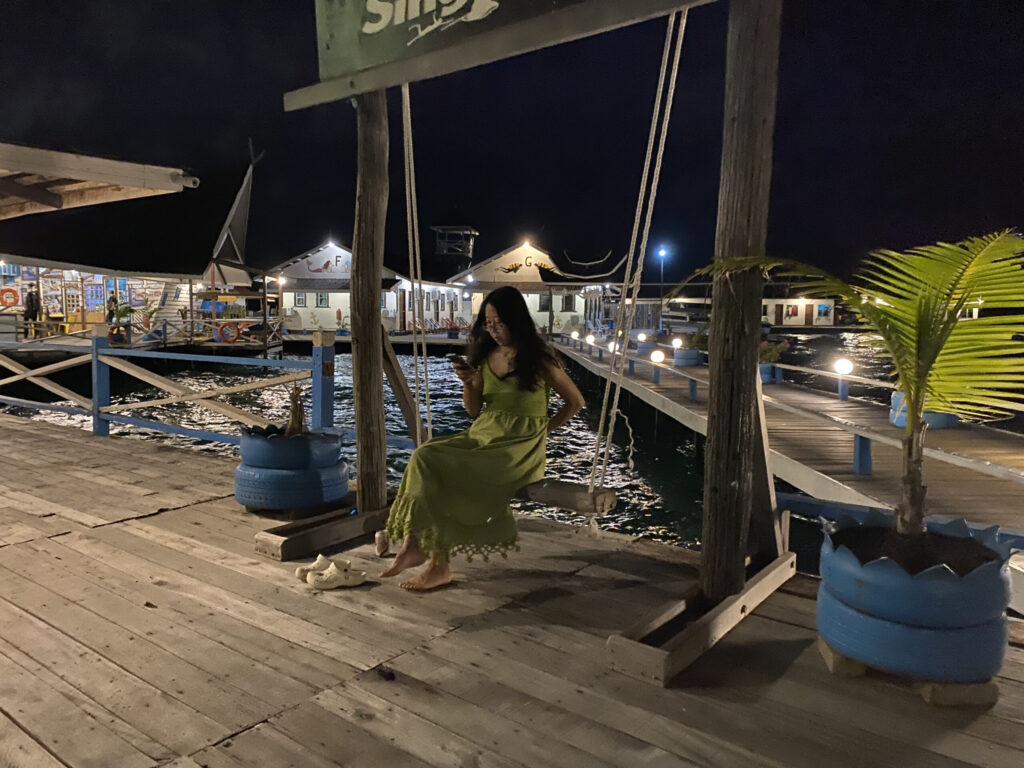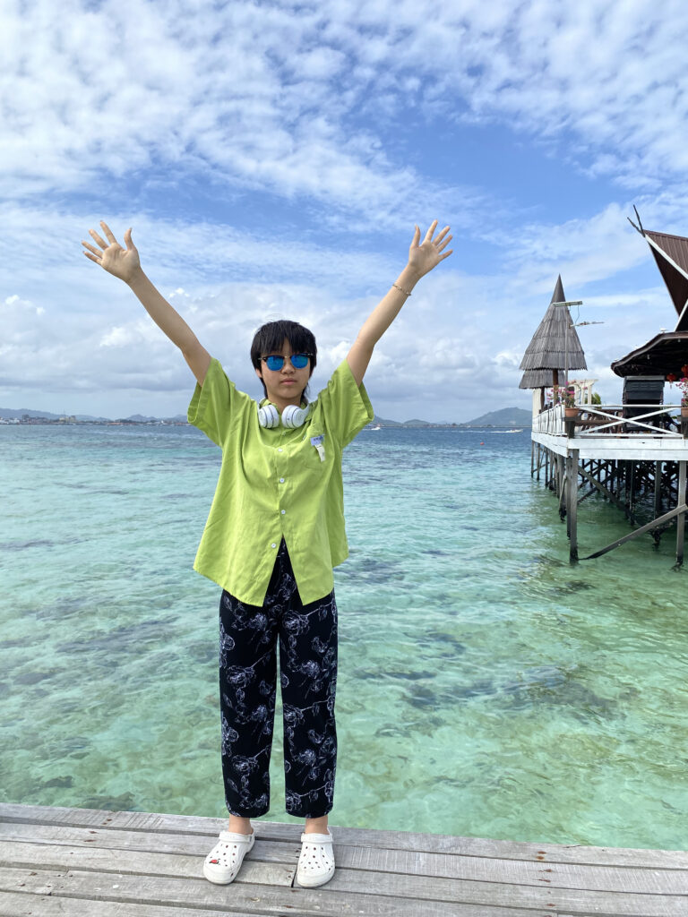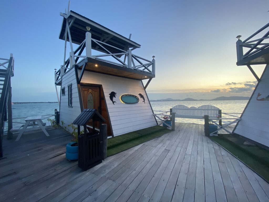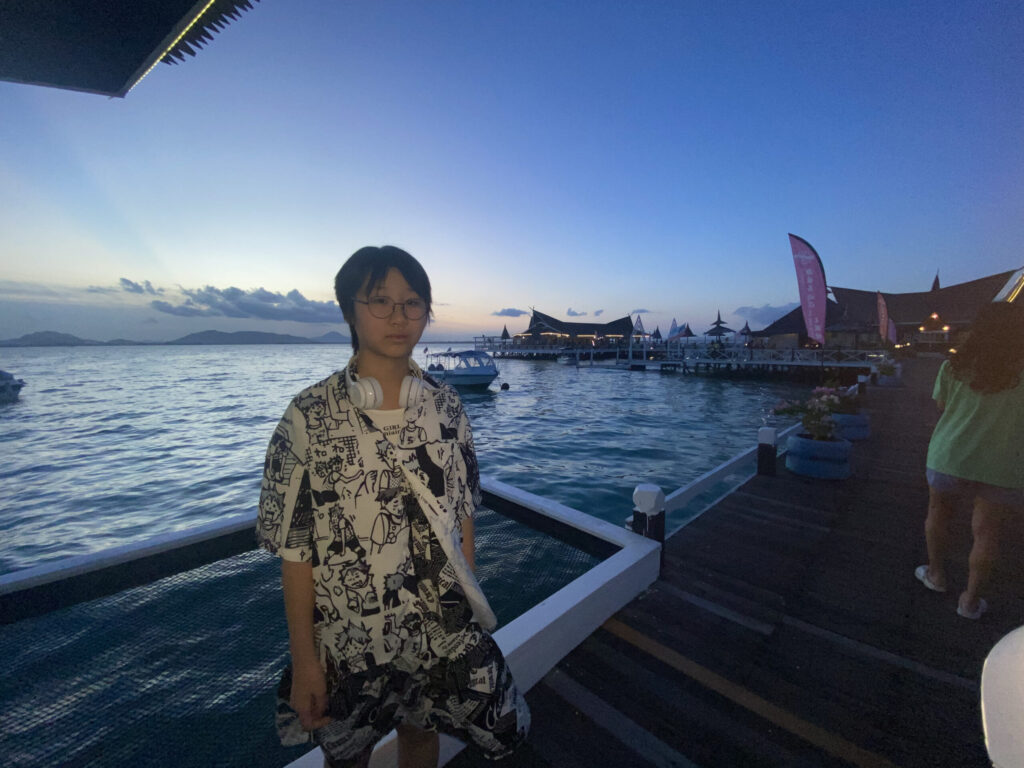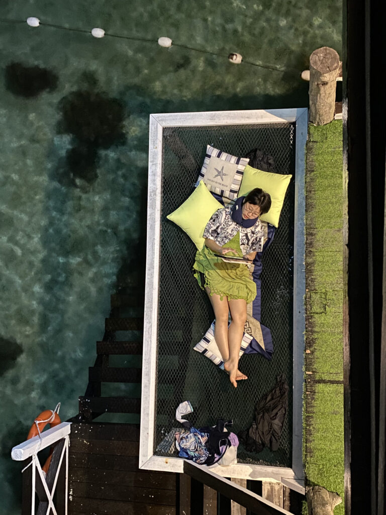 第二天第三天白天也都在学习潜水的过程中度过了。学习之余,在夕阳下潜水,还把一只小螃蟹弄到水桶里玩了一会儿。晚上,小朋友在悬空的软床上惬意地刷iPad。