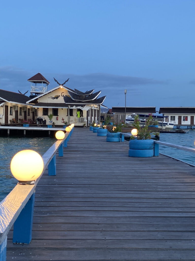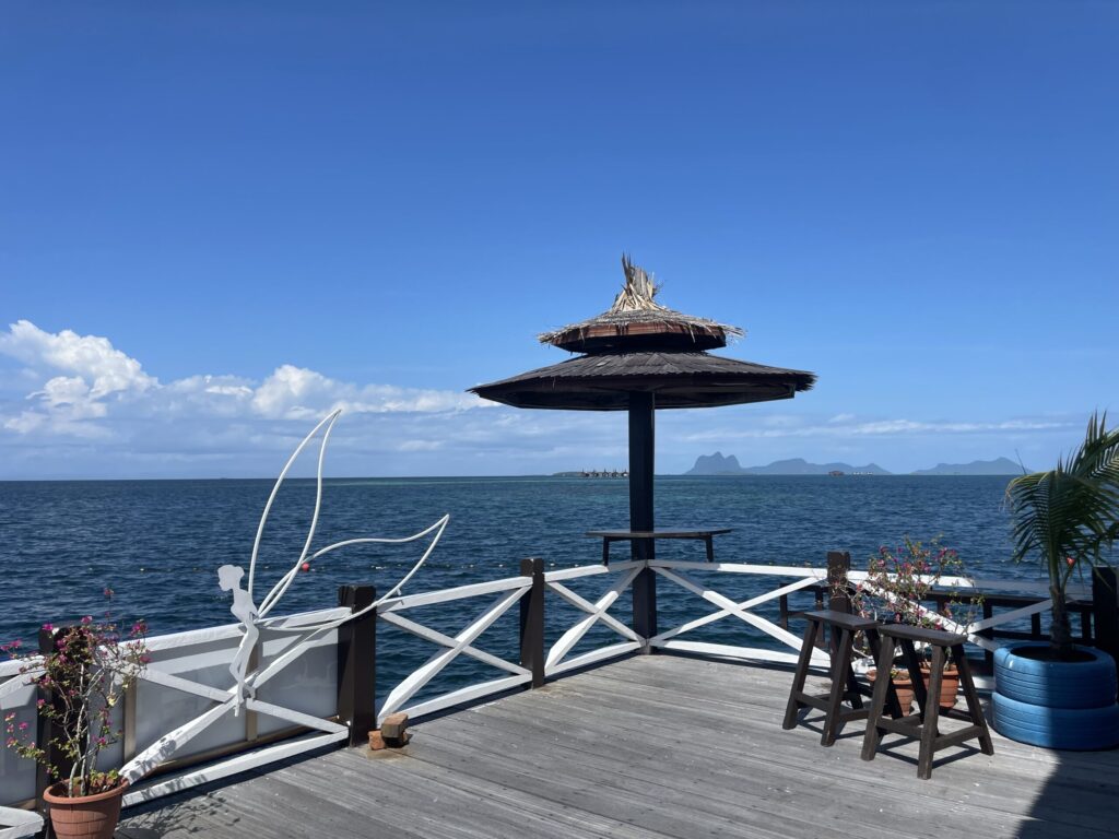 我们房间出来,酒店只有两条通道,一条通往潜水店,一条通往前台和餐厅。走在路上,两边就是碧绿的海水,一下就找到了度假的感觉。