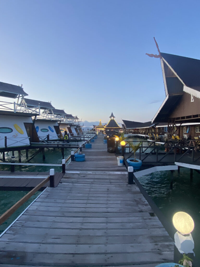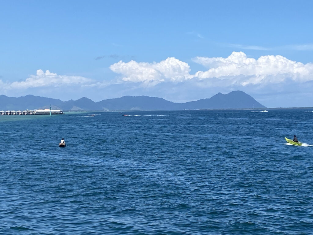 下飞机到了酒店在岸上的接待处,等船的间隙,外面兜了一圈。镇上确实比较老旧,只有靠近码头的一点地方看起来好一些,酒店饭店便利店奶茶店,样样俱全。我们一开始往码头之外的方向走了一下,买了椰子饮料之类。路过码头,下方的海水中,一朵海葵的触须里,有一只大大的黑红色小丑鱼,然而并没有看到她的伴侣。真是替她有些担心会不会被过往的船只撞到。