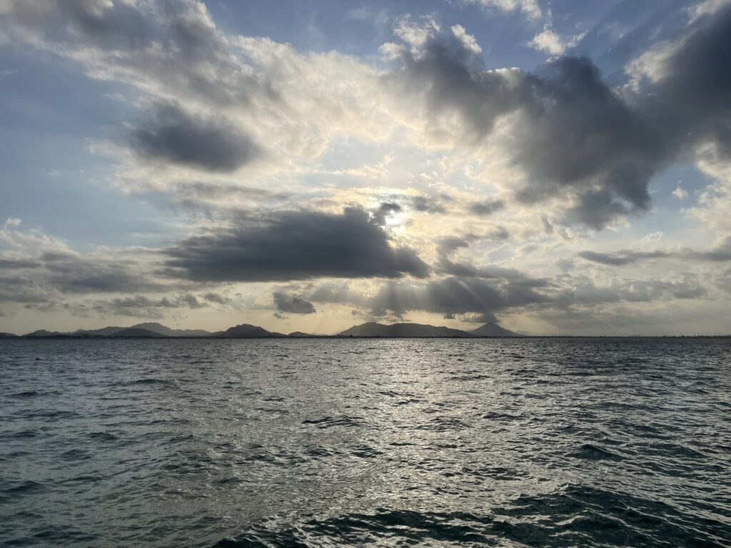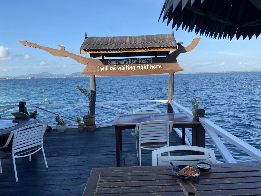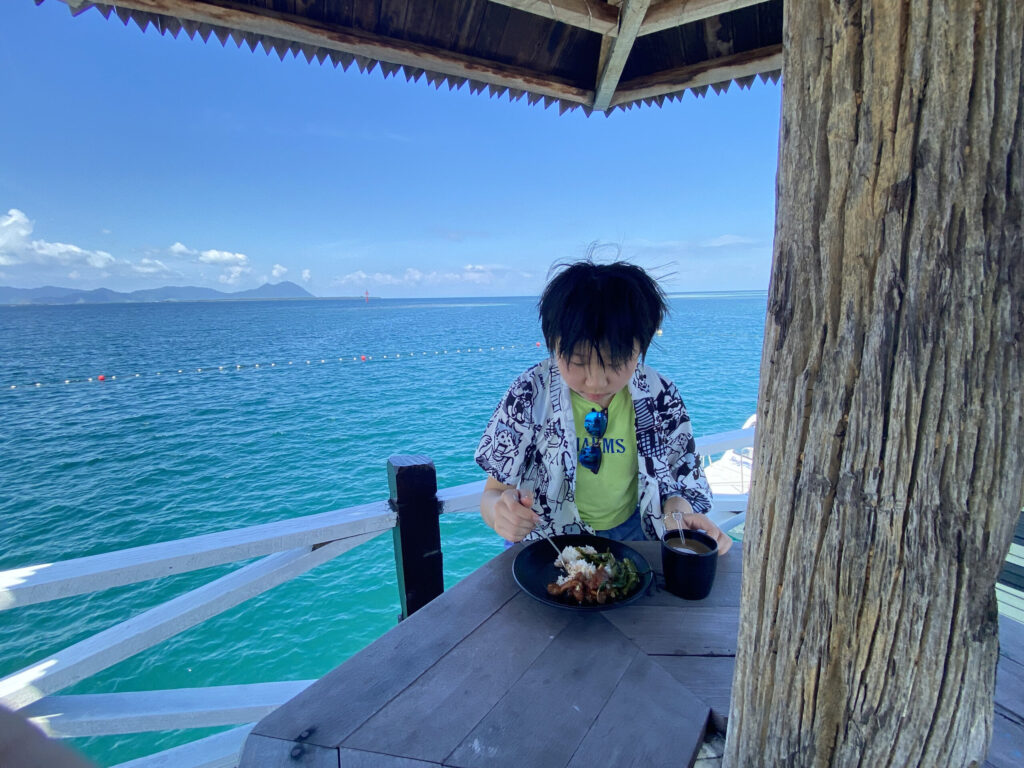 每餐都是自助餐,花样不多,晚餐烤的小鱼蘸着酱吃,味道还挺好。坐在餐厅海边,边看海景边吃东西,很是舒服。阳台、小径、餐厅,处处都可以观赏日落。脚下的水里,成群的小鱼嬉戏,还有长长的颌针鱼,海星,甚至萱萱还看到了一条海蛇。